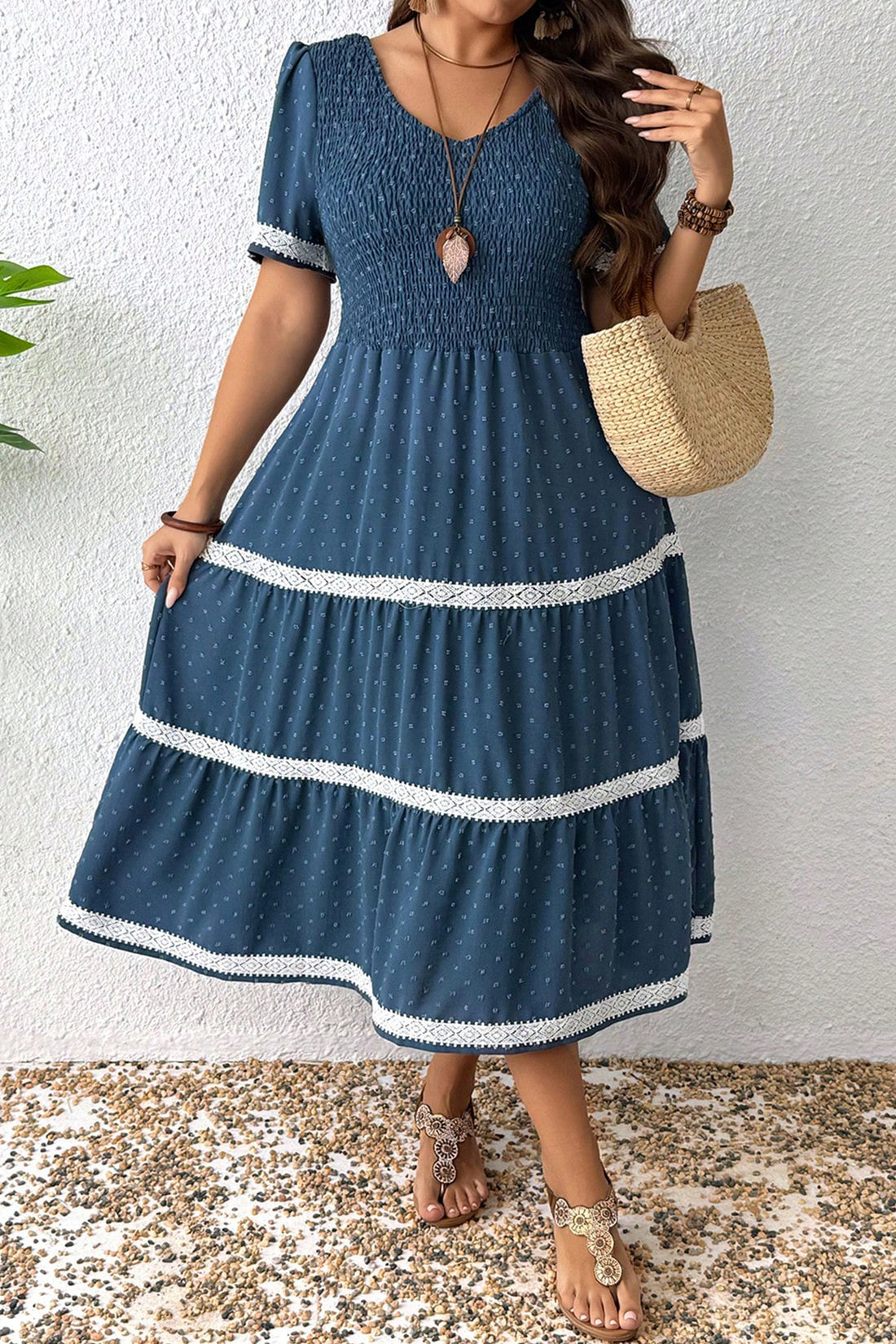 Plus Size Swiss Dot Short Sleeve Smocked Flowy Midi Dress