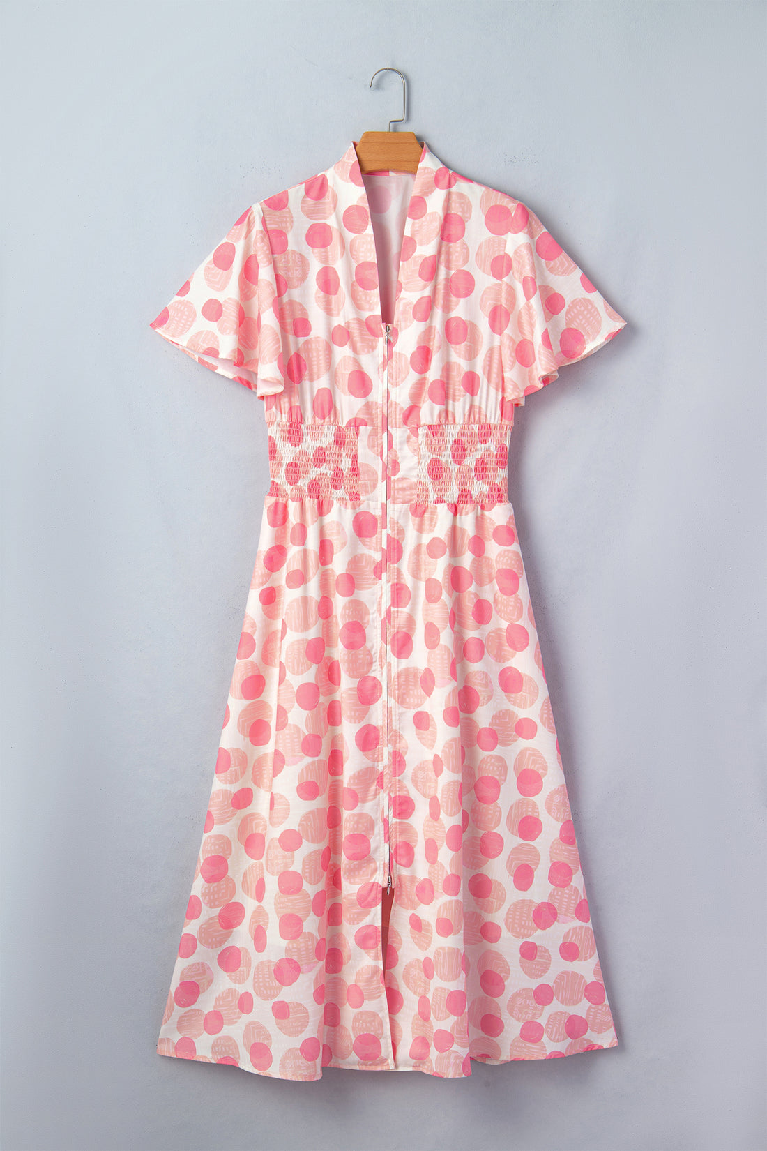 Pink Polka Dot Printed Ruffle Short Sleeve Zip Up Long Dress