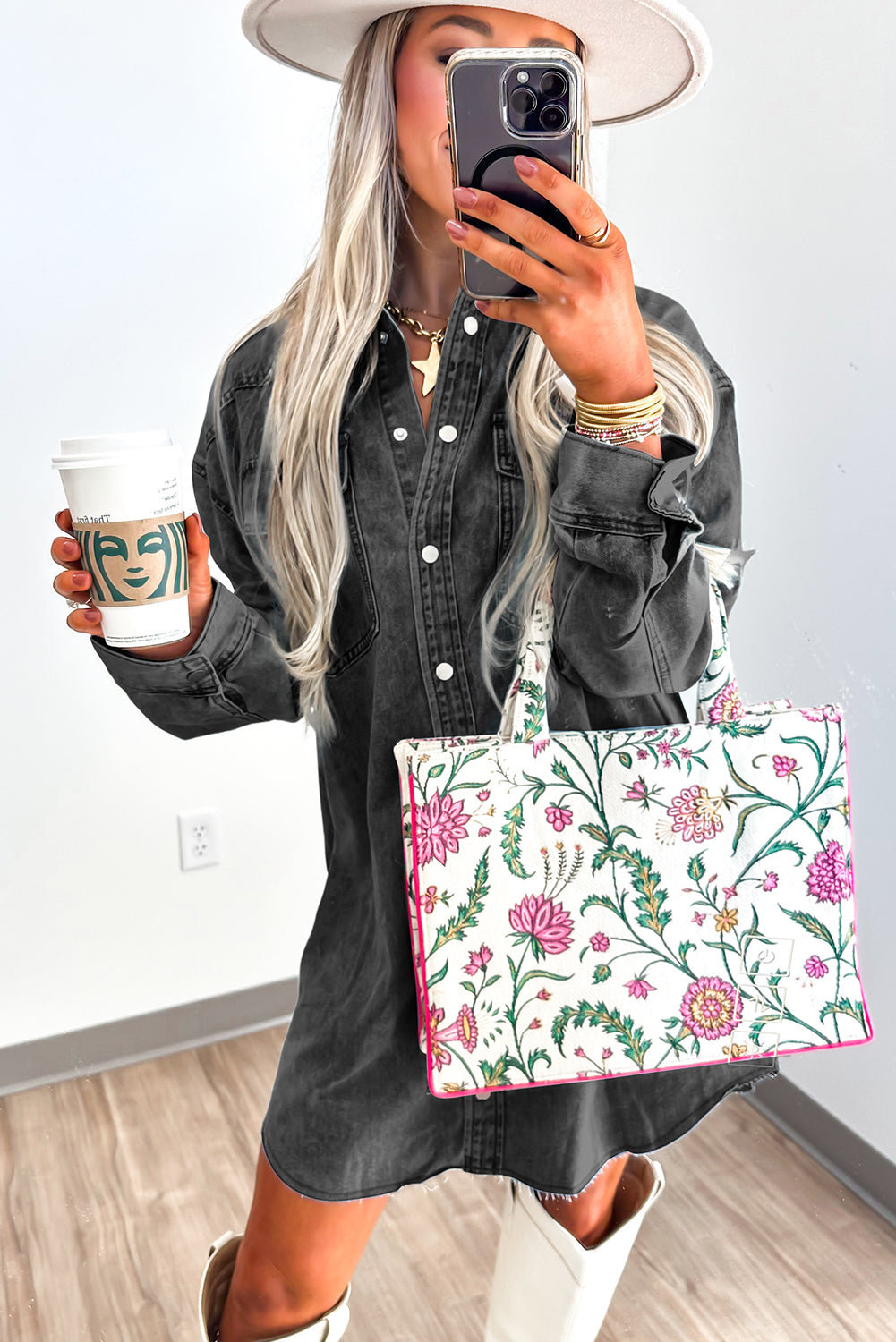 Chest Pocket Raw Hem Denim Baggy Shirt Dress