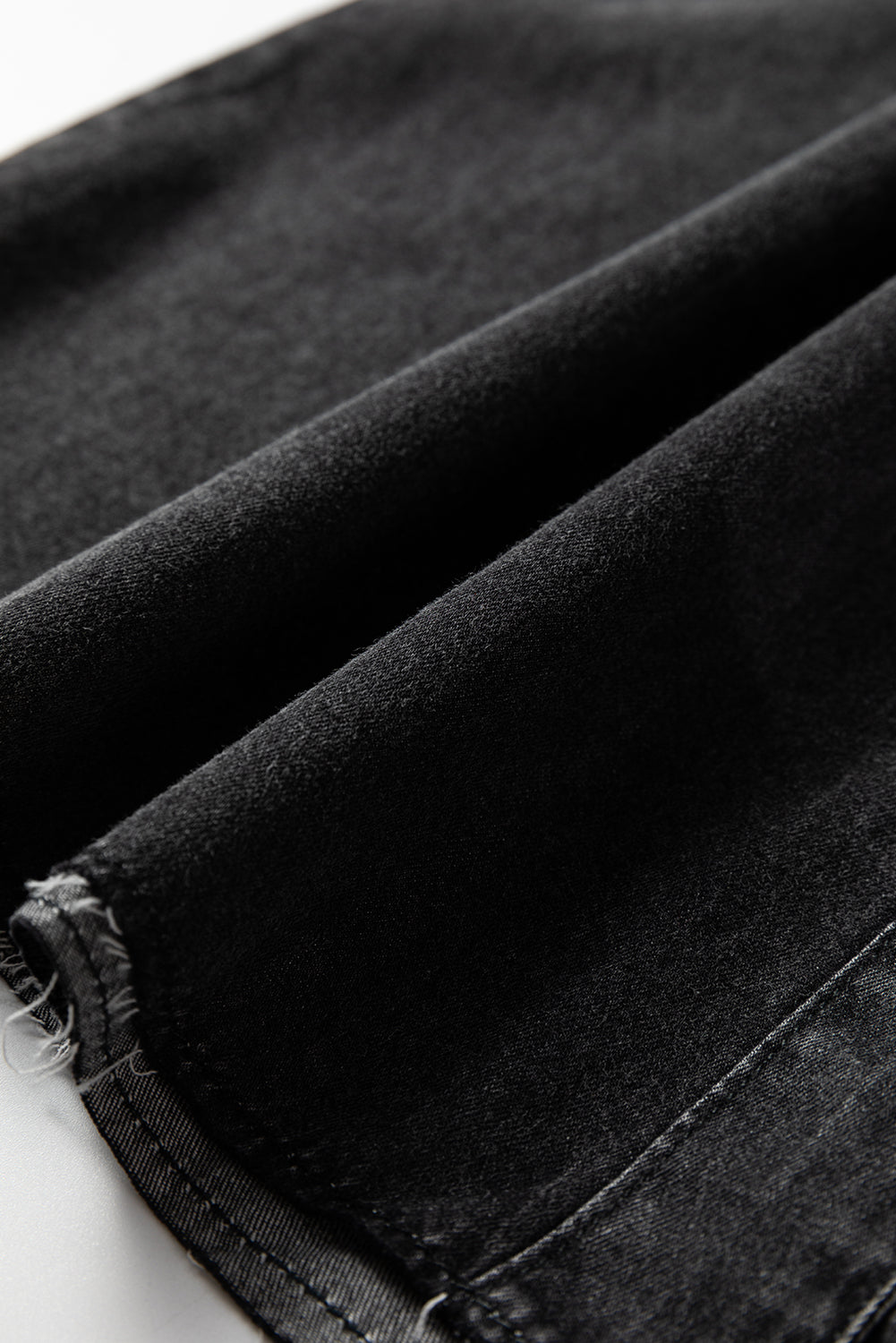 Designed with snap buttons, flap pockets, and raw-edge hemline.