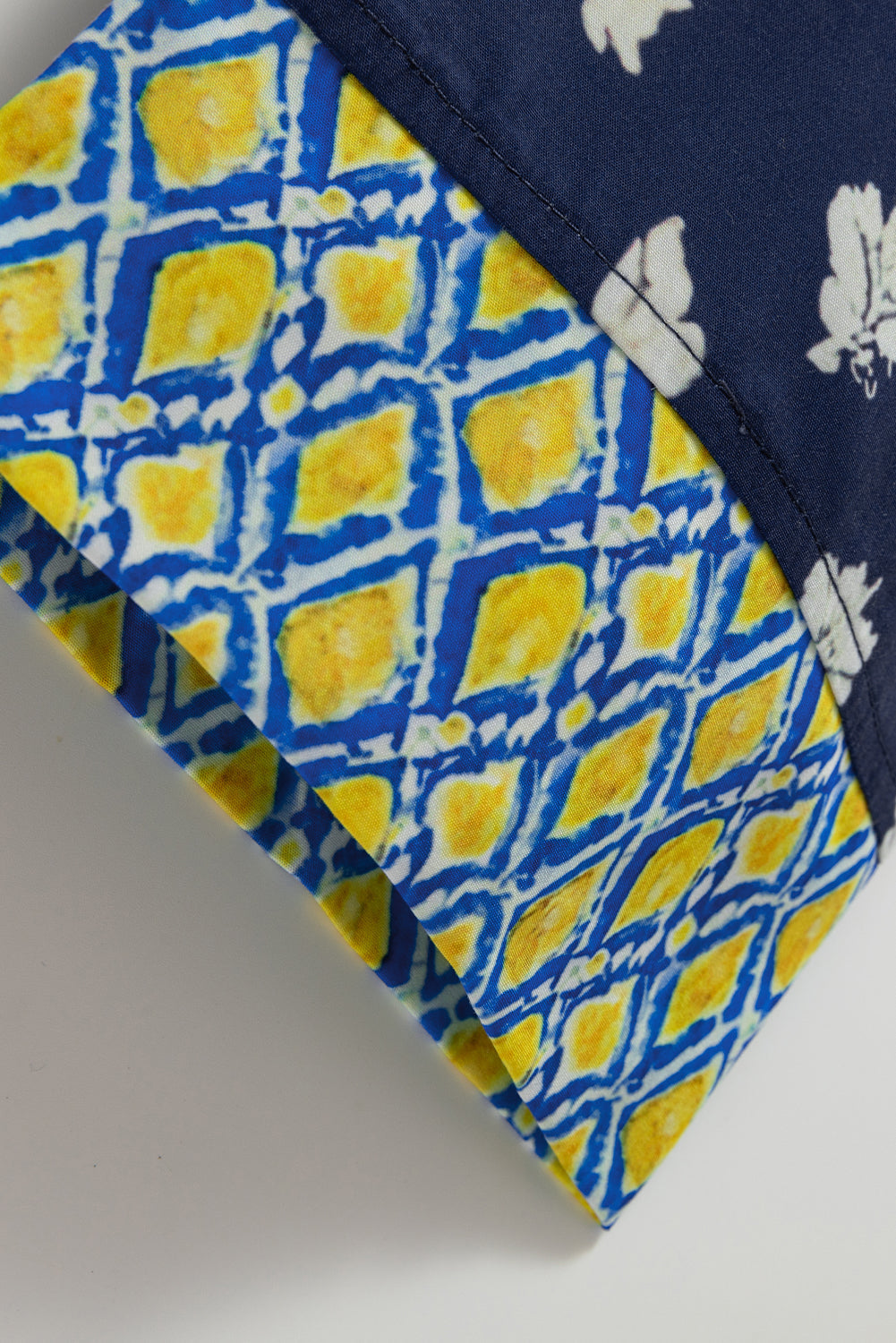 Blue Floral Print Half Sleeve Contrast Trim V Neck Blouse