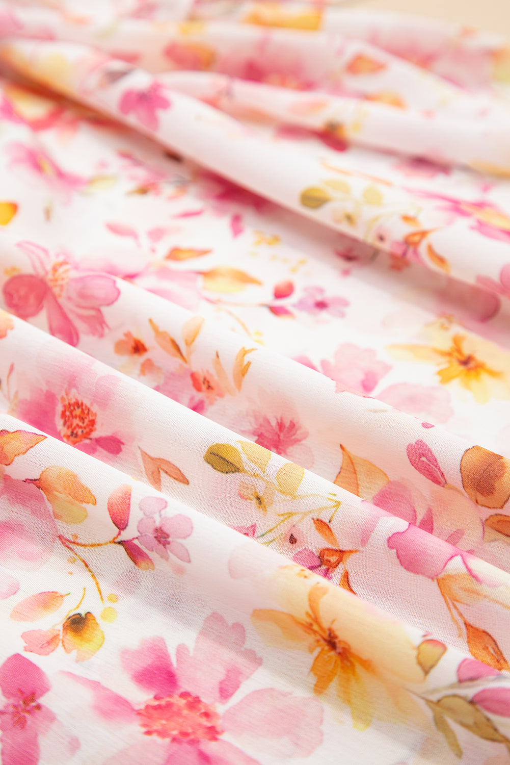 Pink Floral Print Tassel Tie Smocked V Neck Puff Sleeve Tunic Blouse
