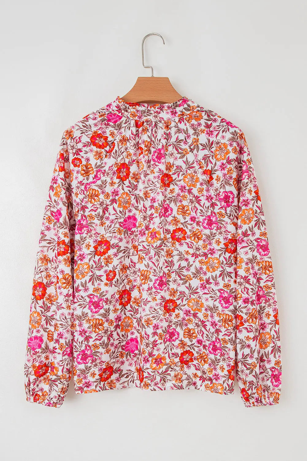 Pink Floral Print Tie Split Neck Bracelet Sleeve Blouse