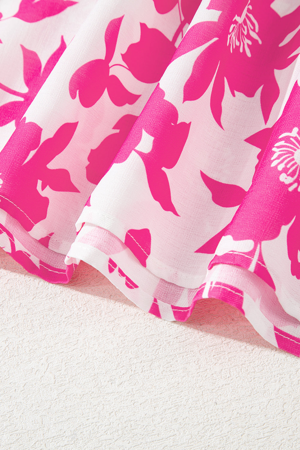 Pink Floral Printed Ruffled Short Sleeve Round Neck Loose Blouse