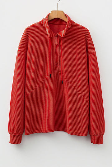 Racing Red Twist Ribbed Half Button Collared Drawstring Pullover Top