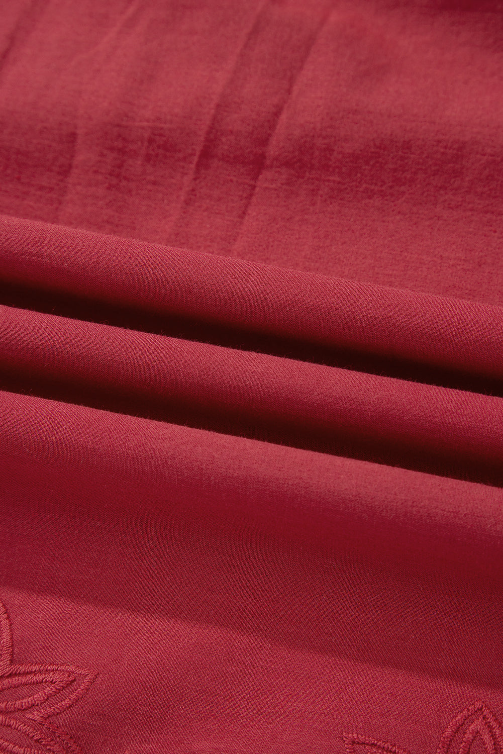 Red Dahlia Floral Embroidered Scallop Trim Short Sleeve V Neck Blouse