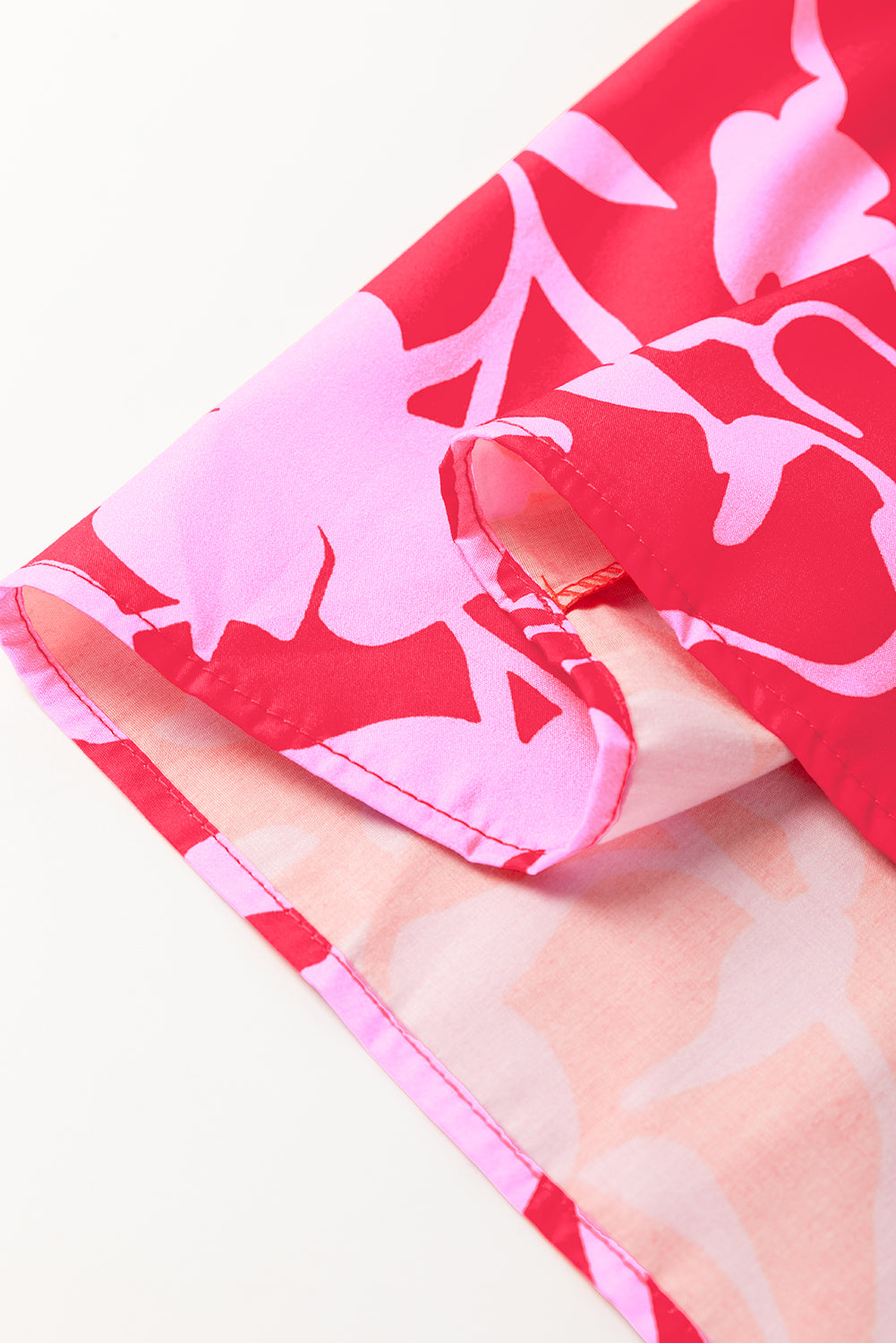 Red Floral Split V-Neck Ruffled Short Sleeve Blouse Top