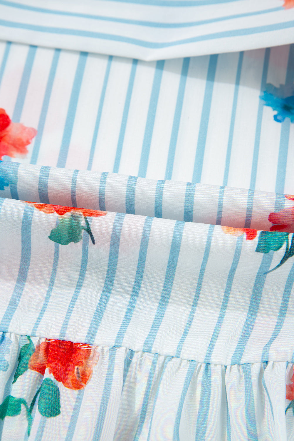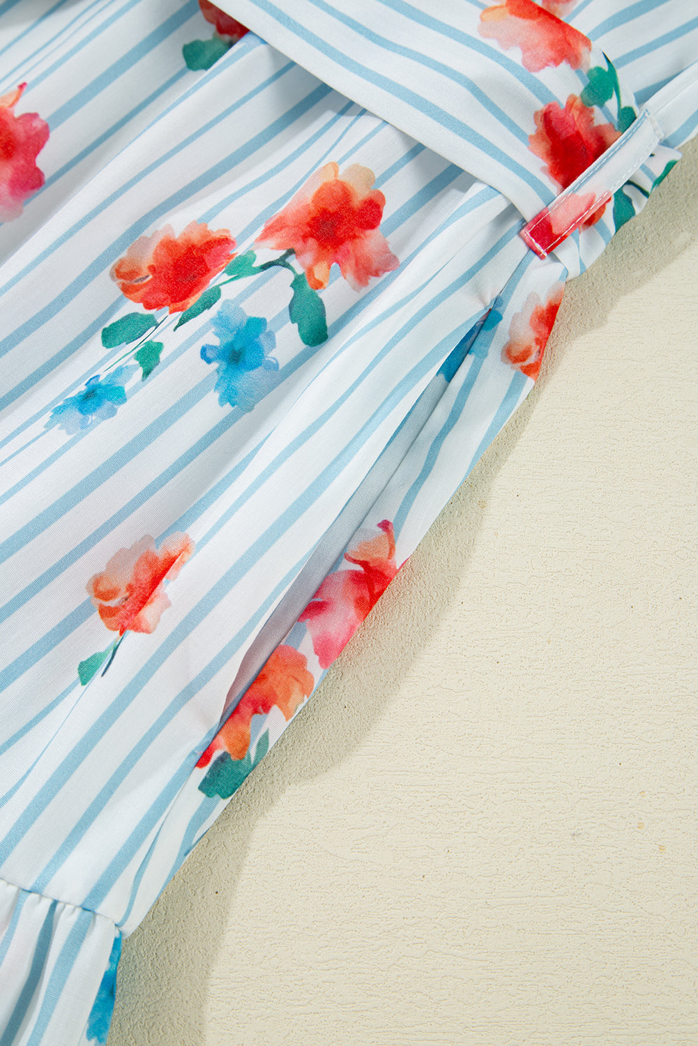 Sky Blue Stripe Floral Pattern Ruffle Short Sleeve Belted Mini Dress