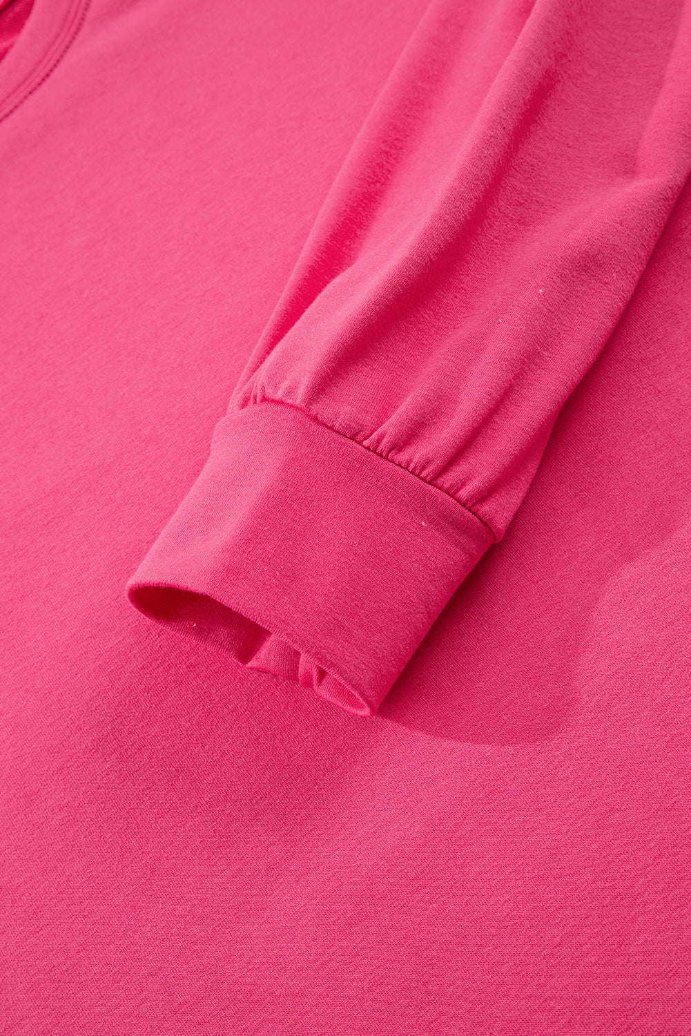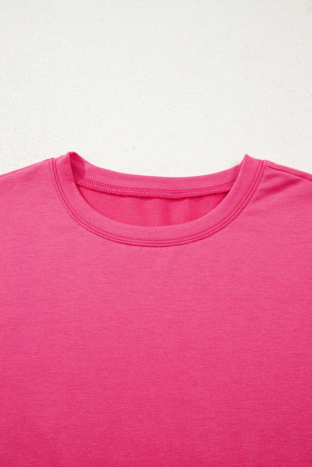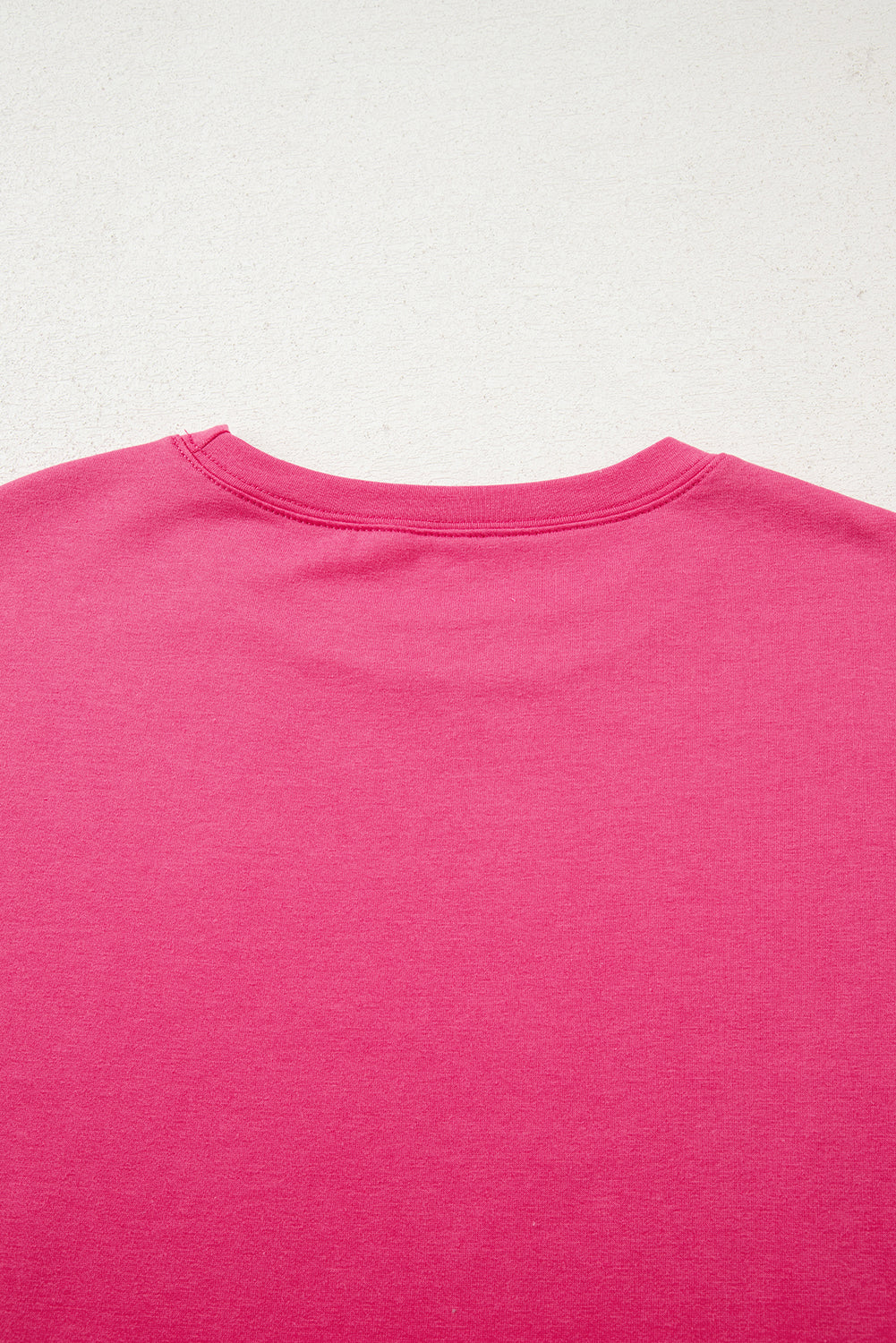 Strawberry Pink Floral Hemline Patchwork Round Neck Casual Top