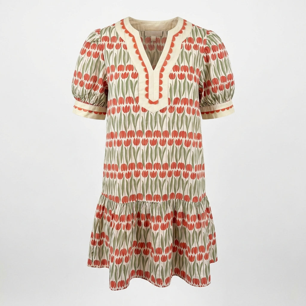 Tulip Floral Print Cotton Puff Short Sleeve Mini Dress